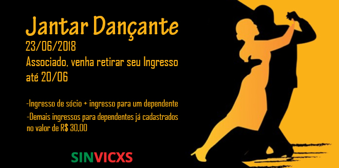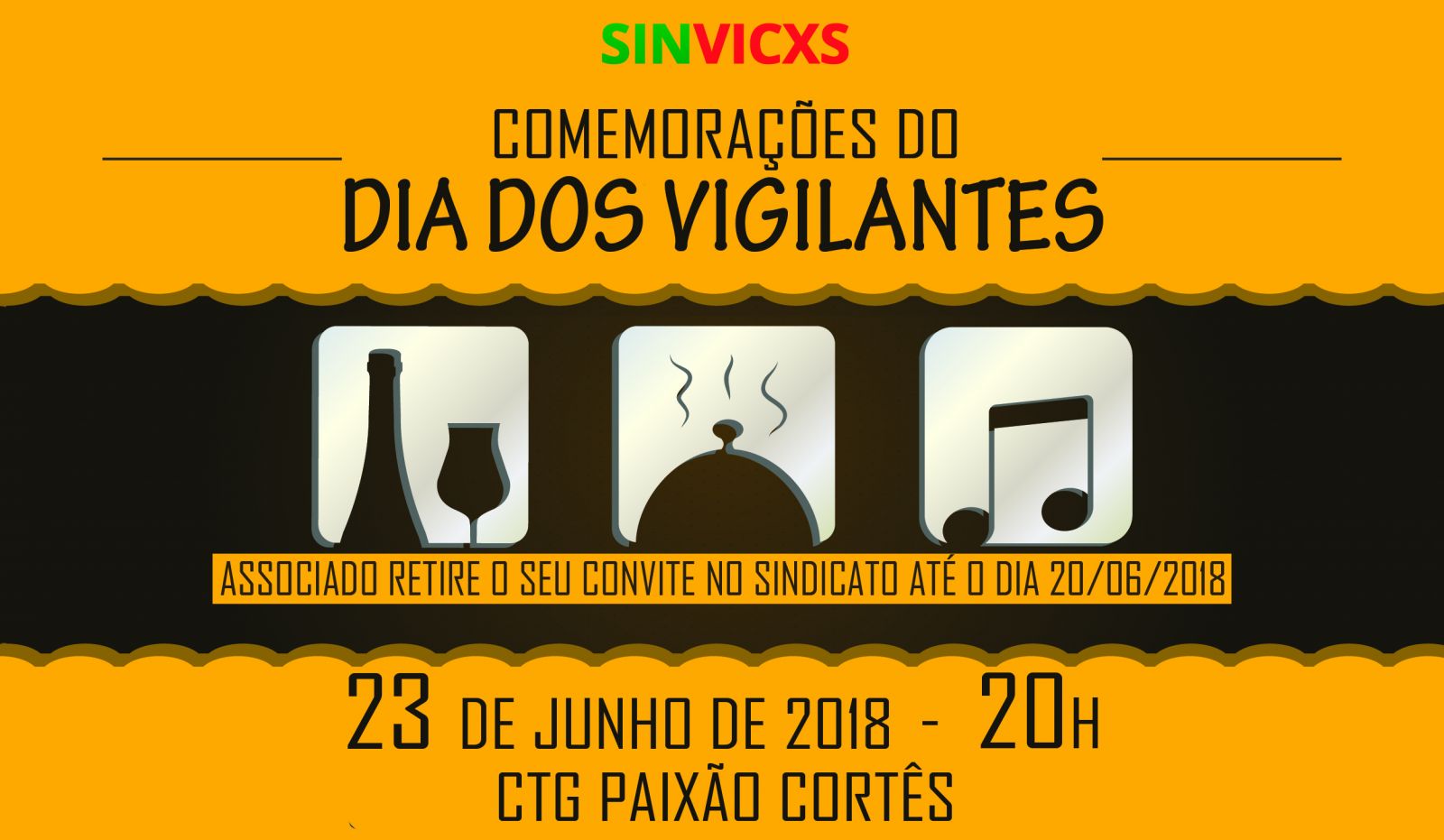 O SINDICATO DOS VIGILANTES DE CAXIAS DO SUL estará promovendo para os seus associados e dependentes um JANTAR DANÇANTE EM COMEMORAÇÃO AO DIA DO VIGILANTE, o qual será realizado no dia 23/06/2018, às 20 horas no CTG PAIXÃO CORTÊS (Rua Luigi Gallichio, nº 370 / em frente ao Centro Esportivo do SESI).